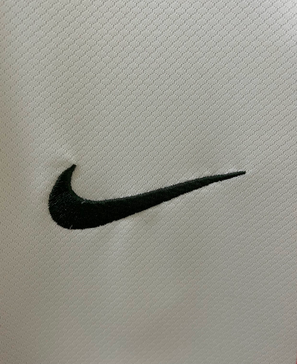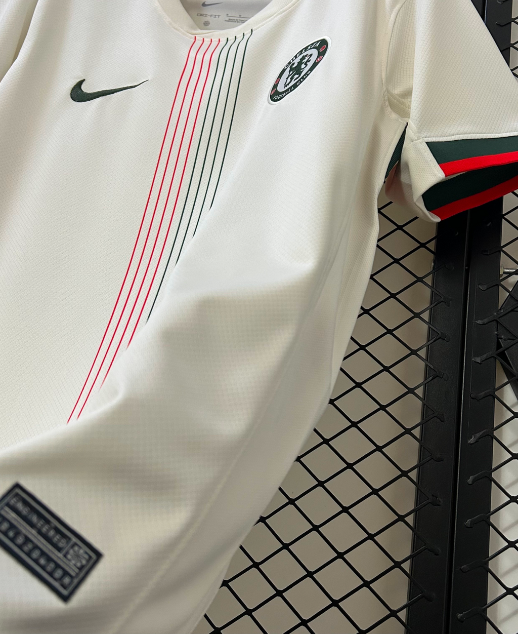 A camisa away do Chelsea 2025/26, assinada pela Nike, apresenta o elegante tom off-white (Phantom) como cor principal, combinado ao verde militar escuro (Galactic Jade) e detalhes em vermelho. O design celebra os 50 anos do uniforme utilizado na temporada 1974/75, resgatando a icônica paleta em branco, vermelho e verde. O grande destaque fica por conta da faixa vertical central, que incorpora as cores históricas em múltiplas linhas paralelas, criando um visual minimalista, sofisticado e cheio de identidade.