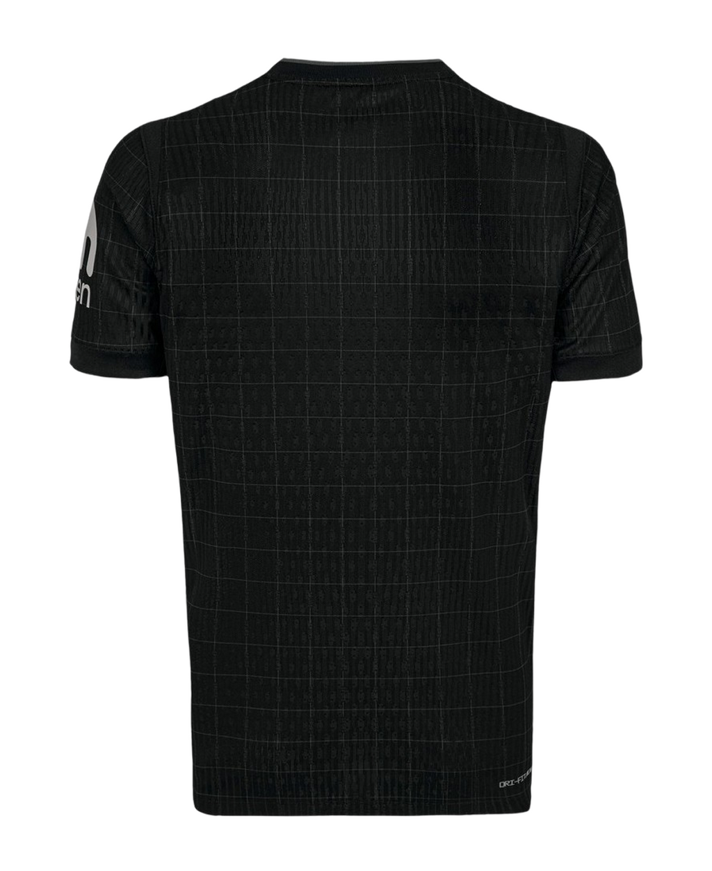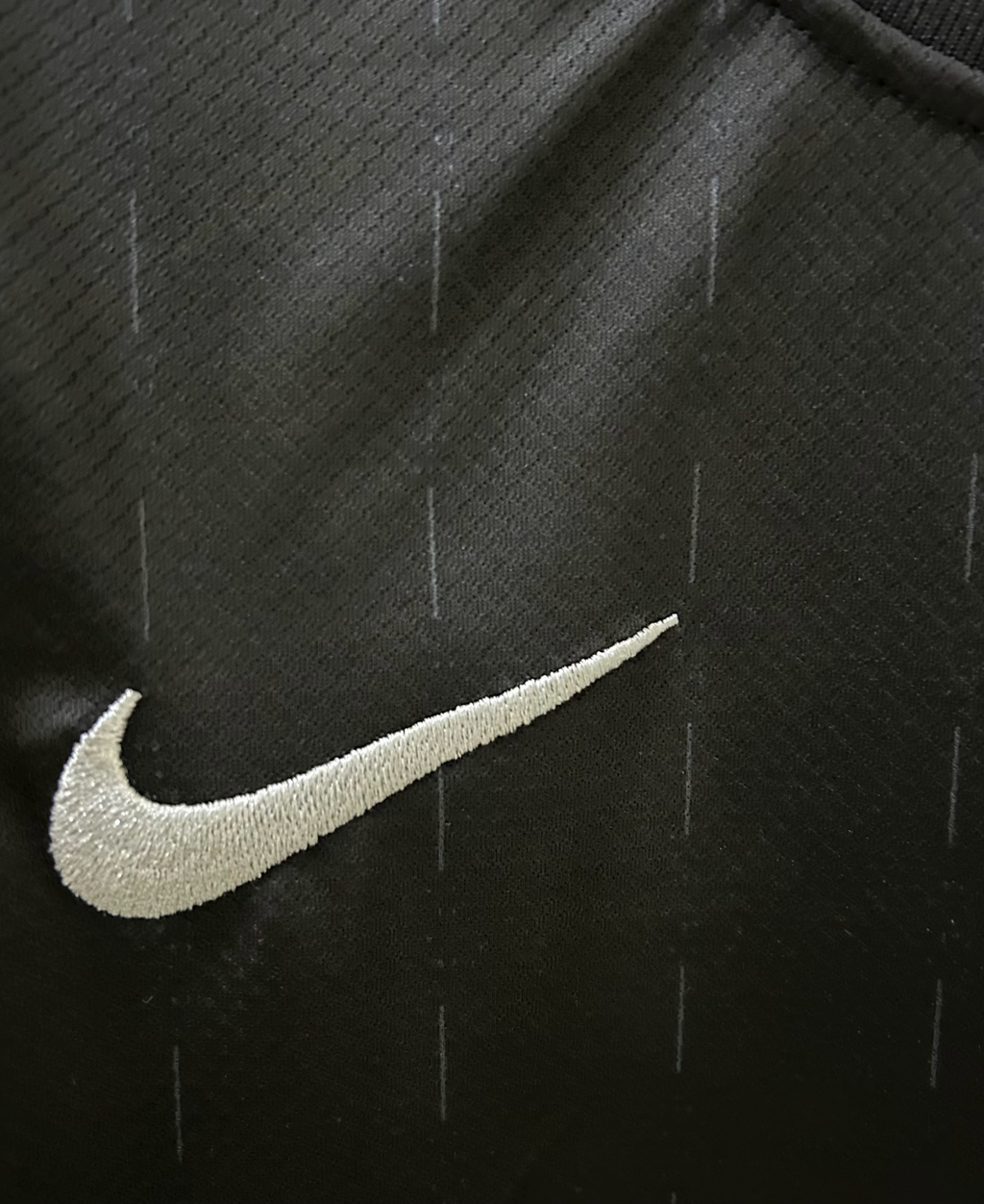 A nova camisa away do Tottenham 2025/26, desenvolvida pela Nike, chega em um design marcante: predominantemente preta, com detalhes em cinza (Lt Iron Ore) e logotipos em branco. Este lançamento tem um peso histórico — é a primeira vez em mais de 10 anos que os Spurs vestem o preto como uniforme alternativo. A última aparição de uma away shirt preta havia sido na temporada 2014/15, tornando este manto uma verdadeira peça de colecionador.